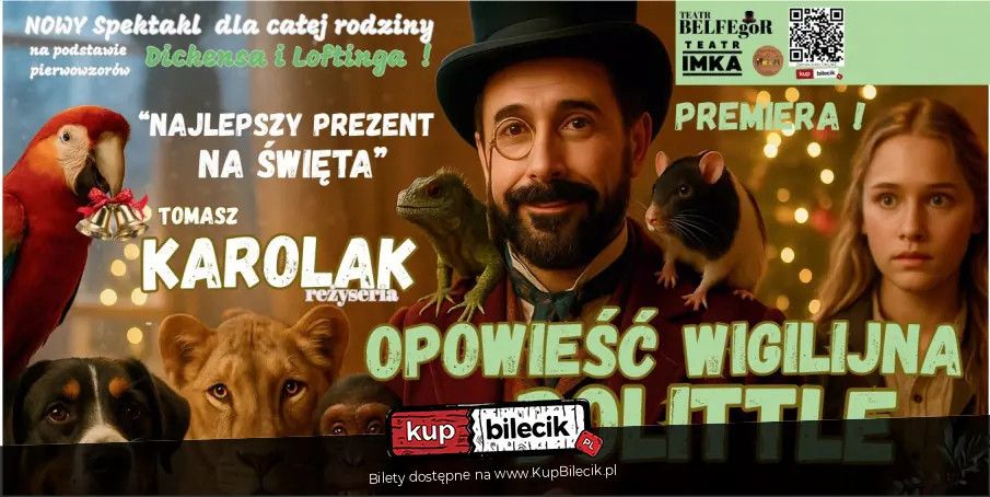 bilety: Na podstawie oryginalnych motywów Charlesa Dickensa i Hugh Loftinga. Po ogromnym sukcesie dwóch widowisk familijnych - "Święta Doktora Dolittle" (2024), które obejrzało ponad 5 000 dzieci oraz "Wyprawa do Dżungli" (premiera czerwiec 2025, ponad 10 000 widzów), Teatr BELFEgOR i IMKA zapraszają na trzeci, najbardziej wzruszający i magiczny spektakl z tej serii! Podczas wydarzenia dzieci będą mogły spotkać Świętego Mikołaja i otrzymać prezenty po zakupieniu biletów z taką opcją. Prezenty przynoszą rodzice podpisane maksymalnie na 1h przed spektaklem do siedziby Teatru w dniu wydarzenia. Prapremierowy pokaz z Mikołajem - 6 grudnia 2025 r. Bilety do nabycia na: KupBilecik.plOpowieść Wigilijna Dr Dolitlle"a artyści: Reżyseria: Tomasz Karolak"Opowieść Wigilijna Dr Dolittle" to pełna emocji, humoru i muzyki historia o przyjaźni, odkupieniu i mocy świątecznego dobra – tym razem z udziałem żywych zwierząt! W magicznej atmosferze Bożego Narodzenia Dr Dolittle spotka ducha dawnych świąt i odkryje, że nawet najmniejsze stworzenie może odmienić świat. Bilety do nabycia na: KupBilecik.pl |