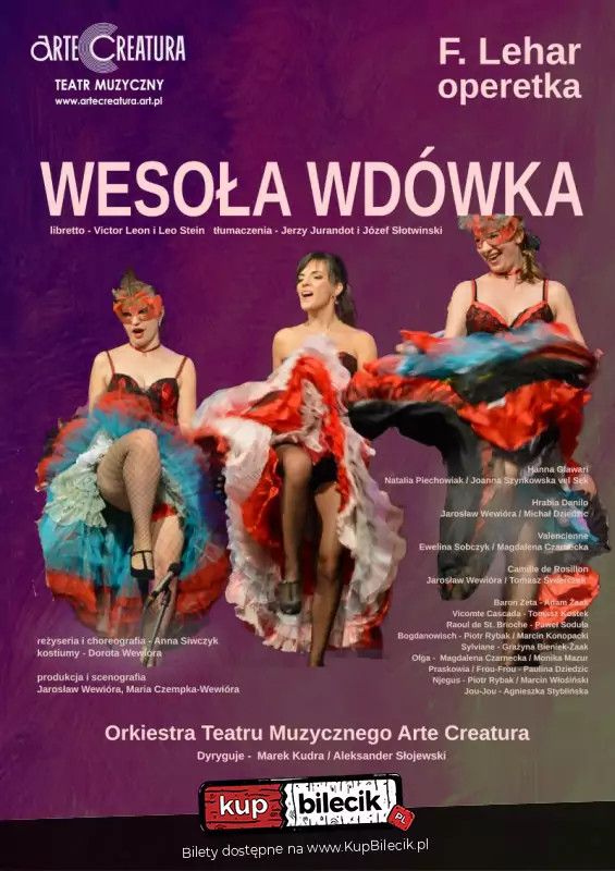 bilety: Arte Creatura Teatr Muzyczny zaprasza na Wesołą wdówkę F. Lehára! Operetkę z hitami: Usta milczą, dusza śpiewa! i Ach, kobietki! Zobacz kultową operetkę Wesoła wdówka F. Lehára, pełną frywolnego humoru i pięknych melodii, które od lat bawią i wzruszają publiczność na całym świecie. Daj się ponieść emocjom i zanuć z nami hity: Usta milczą, dusza śpiewa! i Ach, kobietki! Znakomici SOLIŚCI, świetna ORKIESTRA, energetyzujący TANIEC, gustowne KOSTIUMY i cudowne GŁOSY. Wesoła wdówka (Die lustige Witwe) Franza Lehára z roku 1905 odniosła ogromy sukces i okrzyknięto ją arcydziełem gatunku. Uznawana jest za najlepszą i najczęściej graną operetkę, przepełnioną szlagierami na czele z hitem: Usta milczą, dusza śpiewa. W rolach głównych wystąpią artyści Teatru Muzycznego Arte Creatura, m.in.: Natalia Piechowiak / Maria Hubluk / Ewelina Wiśniecka jako Hanna Glawari, Jarosław Wewióra jako Hrabia Daniło Danilowitsch, Wioletta Liber / Katarzyna Guran / Klara Kania-Sadowska / Magdalena Okońska jako Valencienne, Jarosław Wewióra / Tomasz Świerczek / Chaoran Zuo jako Camille de Rosillon, Adam Żaak jako Baron Mirko Zeta, Tomasz Kostek jako Vicomte Cascada, Paweł Soduła jako Raoul de St. Brioche, Marcin Konopacki / Paweł Bielawski jako Bogdanowitsch, Grażyna Bieniek-Żaak jako Sylviane, Monika Mazur / Agnieszka Styblińska-Elbin jako Olga, Piotr Rybak / Marcin Włosinski jako Njegus. Wesoła Wdówka - operetka F. Lehara - Arte Creatura Teatr Muzyczny artyści: Artyści Teatru Muzycznego Arte Creatura, Orkiestra Teatru Muzycznego Arte CreaturaWesoła wdówka to arcydzieło gatunku. Uznawana jest za najlepszą i najczęściej graną operetkę, przepełnioną szlagierami na czele z hitem Usta milczą, dusza śpiewa. Tytułowa wdówka to młoda Hanna Glawari, której bogaty mąż umiera po ośmiu dniach małżeństwa. Bakier był obywatelem małego księstwa Pontevedro, dlatego wszyscy jego obywatele martwią się, by kobieta nie wyszła za obcokrajowca, a jej pieniądze nie odpłynęły za granicę. Tymczasem Hanna wyjeżdża do Paryża, gdzie spotyka rodaka i dawną miłość - hrabiego Daniłę. Dumny Hrabia wyznaje Hannie miłość dopiero po wiadomości, że w przypadku powtórnego zamążpójścia jej majątek przepada. Szczęśliwie okazuje się jednak, że przepada na rzecz kolejnego męża. Bilety do nabycia na: KupBilecik.pl |