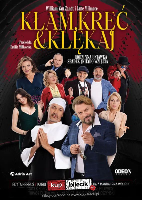 bilety: "Kłam, kręć i klękaj" to wybuchowa komedia pomyłek, która udowodni, że nawet największe życiowe katastrofy można obrócić w dobrą zabawę - wystarczy odrobina sprytu, masa kłamstw i... przebranie za zakonnicę. Kłam, kręć i klękaj artyści: Magdalena Wójcik, Maria Świłpa, Edyta Herbuś, Karolina Nowakowska. Rafał Cieszyński i inniTom i Bill - duet pechowców, którzy nieustannie pakują się w kłopoty - dowiadują się o śmierci swojego bogatego dziadka. Niestety, cała fortuna ma trafić do ich kuzynki... zakonnicy. W sytuacji, gdy Tom jest po uszy zadłużony u groźnego gangstera, bracia wpadają na szalony plan: porwać kuzynkę i podszyć się pod nią, by przejąć spadek. Problem w tym, że kłamstwo ma krótkie nogi. Co może pójść nie tak Odpowiedź: absolutnie wszystko. Jeśli kochasz farsy, śmiech do łez i sytuacje, w których wszystko idzie nie tak - to spektakl dla Ciebie. Humor na poziomie "Głupiego i głupszego", zwroty akcji jak u Tarantino i bohaterowie, którzy bardziej przypominają saperów bez mapy niż zwycięzców - a jednak wychodzą z każdej opresji cało (czasem...). Bilety do nabycia na: KupBilecik.pl |